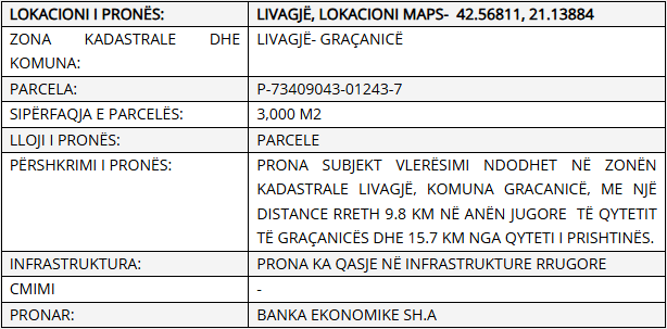 Banka Ekonomike Sh.A. Prishtinë, njofton të gjitha palët e interesuara se ka vënë në shitje paluajtshmërinë e saj me detajet e shënuara më poshtë: