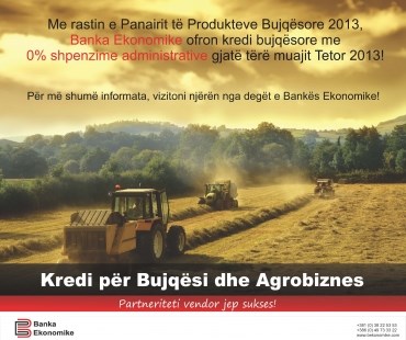 Me rastin e mbajtjës së Panairit të Produkteve Bujqësore 2013, për të gjithë klientët e sektorit të Bujqësisë Banka Ekonomike ofron Kredi Bujqësore me 0% shpenzime administrative gjatë tërë muajit Tetor.